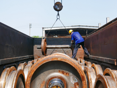 在露天軌道線上停靠著多輛鐵皮敞車車廂,而車輪車間的搬運工人則需要將車軸、輪餅和輪對進行卸車作業,他們用來吊運輪對的起重吊裝設備是行車,正式吊運時,由一人負責操控行車,熟練地運作吊鉤,使其上下吊運,而站立在貨車車廂上的司機則負責使用安全鉤和其他的吊索具將一條超過1噸重的輪對穩穩吊起。